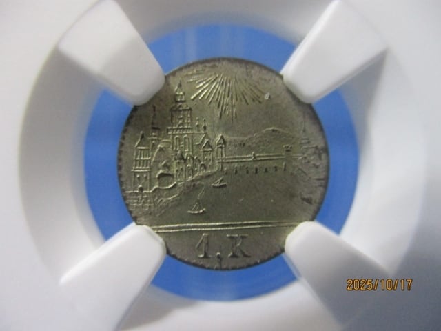 ◎裏面デザイン:都市の風景が描かれ、下部に「1 K」(1クロイツァー)の額面表示があります。