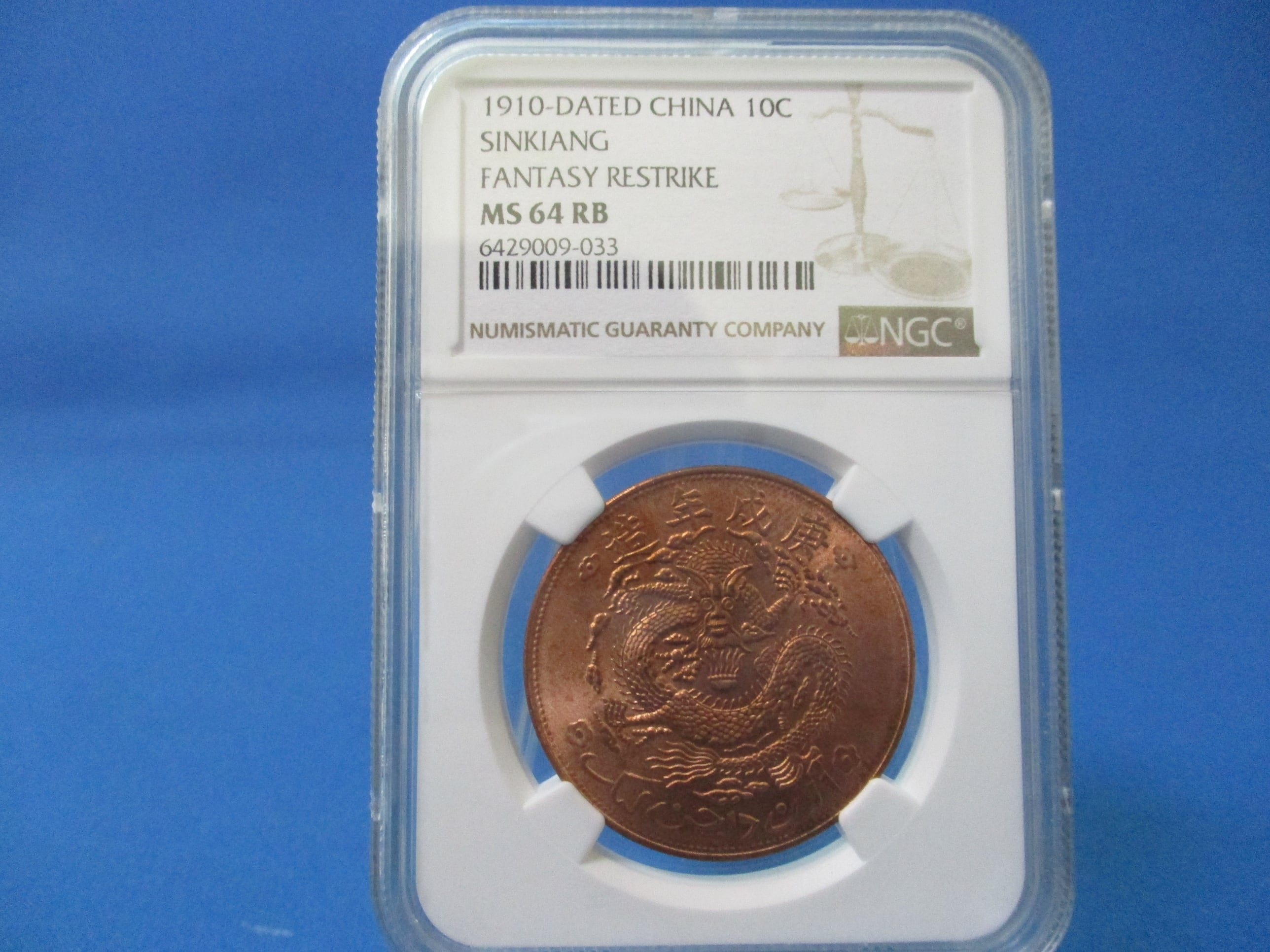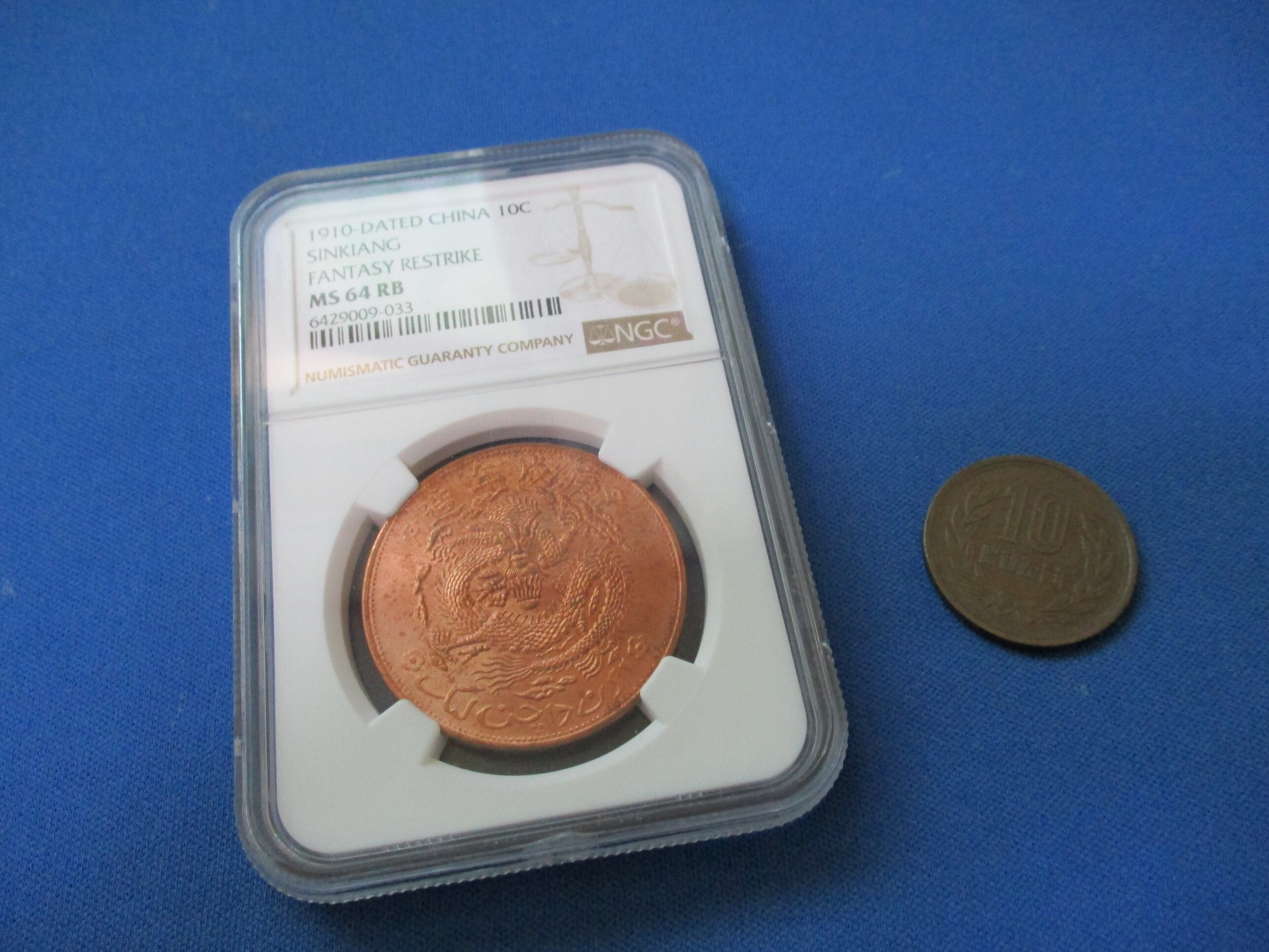 中国 新疆省ウイグル自治区 宣統元宝 紅銭十文☆1910年/未使用/ファンタジーリストライク/NGC MS64RB