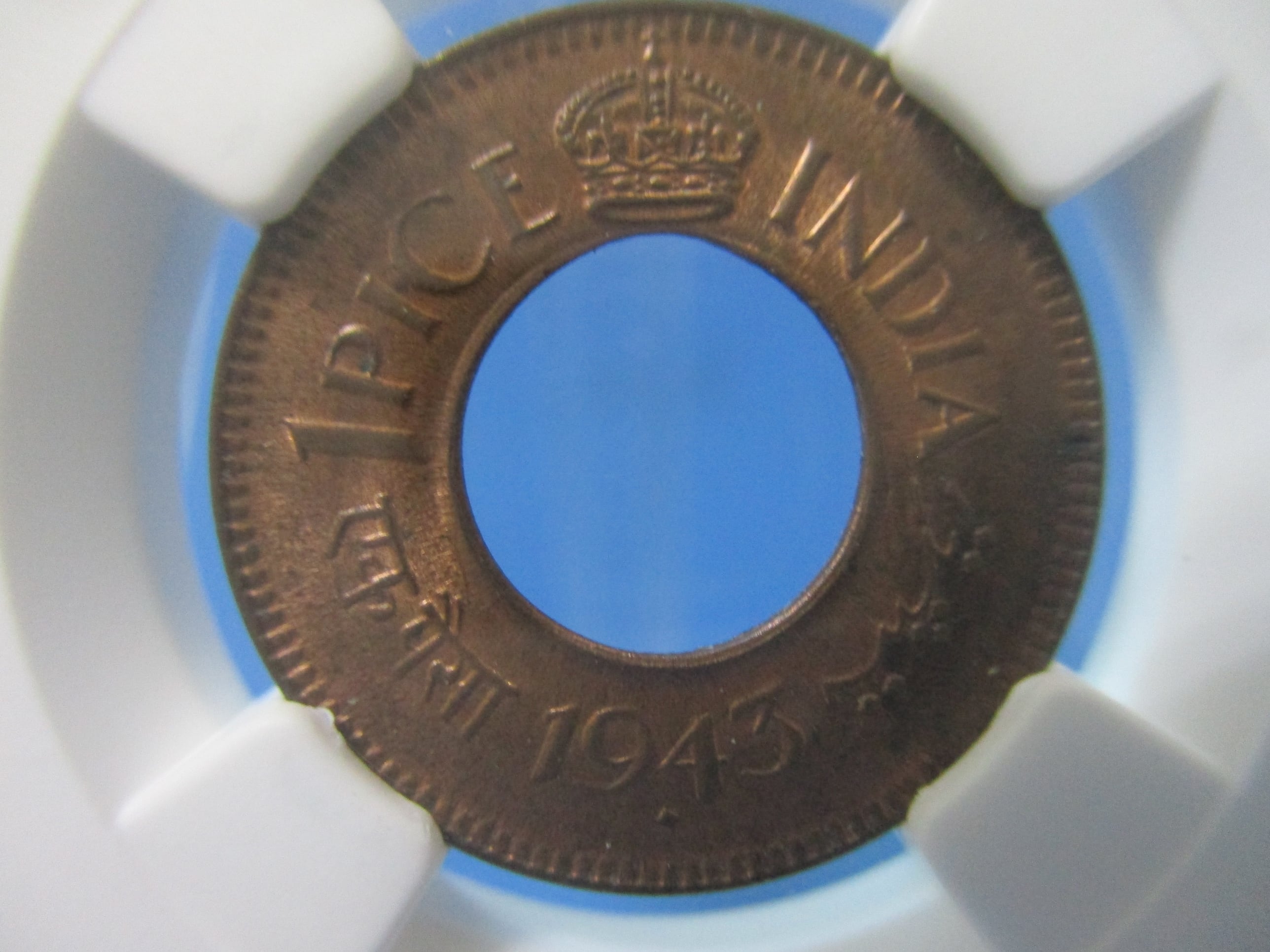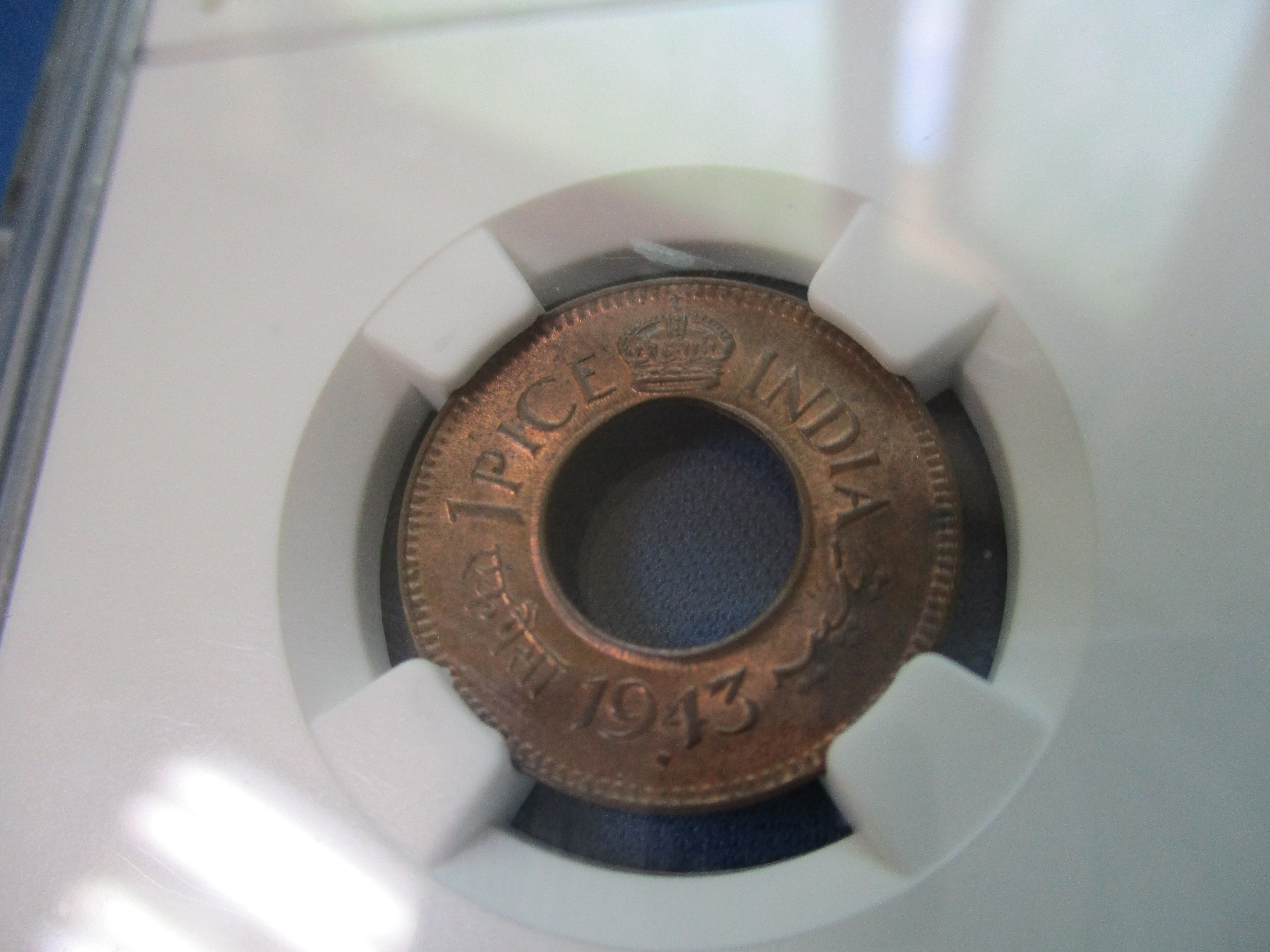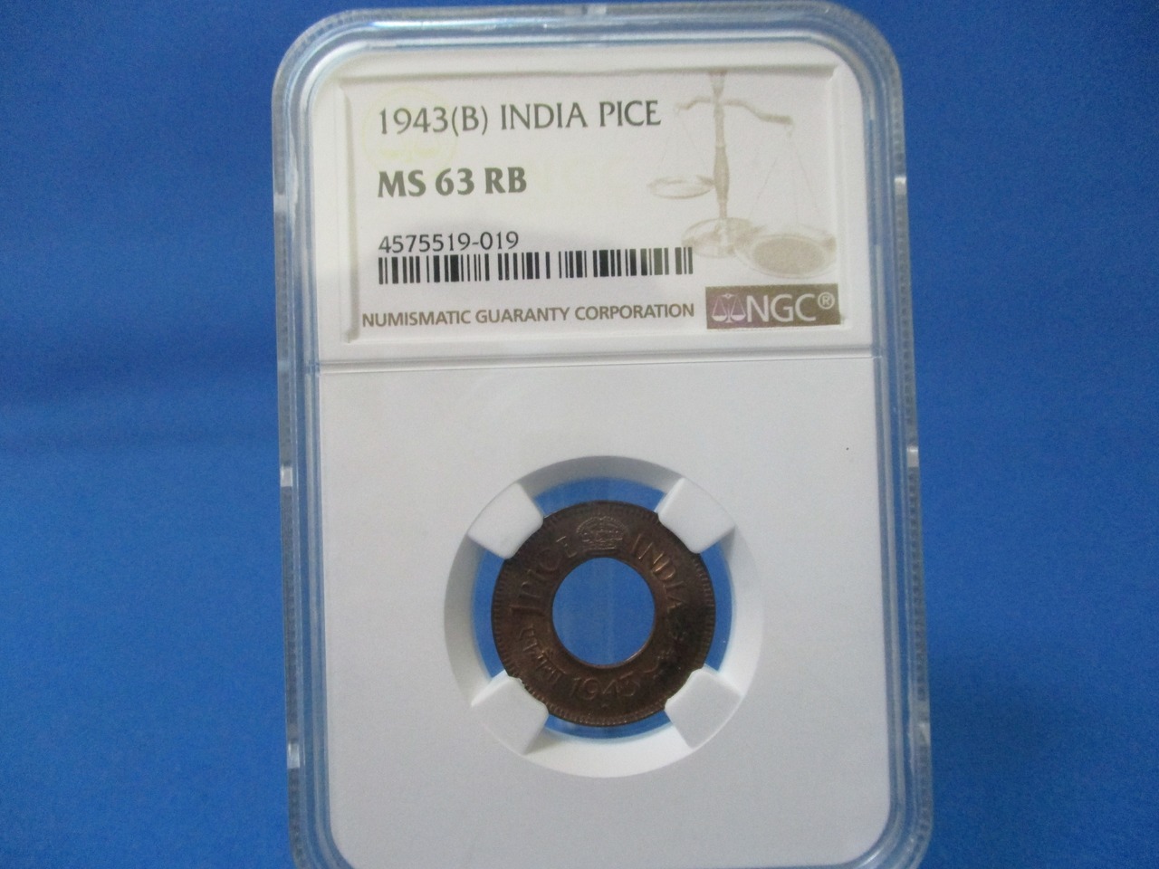 イギリス領インド 1パイス銅貨☆1943年(B)/未使用/NGC MS63RB/本物保証