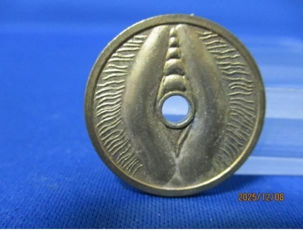 女陰銭は、日本の民間信仰に基づくお守り銭の一種で、主に「財を生む」「子宝」「安産」「婦人病除け」のご利益があるとされる縁起物です。