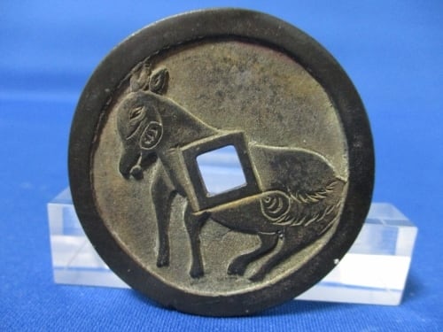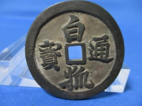 表面に「白狐通宝」の文字と狐の絵柄、中央に方穴。