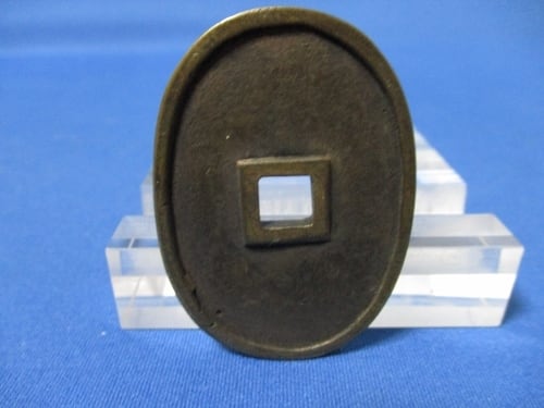 天保形絵銭「万代」は天保通宝の小判型デザインを模倣しています。