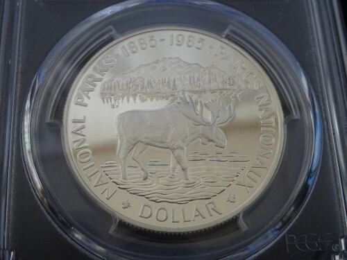 【PCGS 69 準最高鑑定】カナダ国立公園1ドル銀貨(1985年)/ヘラジカ&ヤングエリザベス/ディープカメオ 本物保証