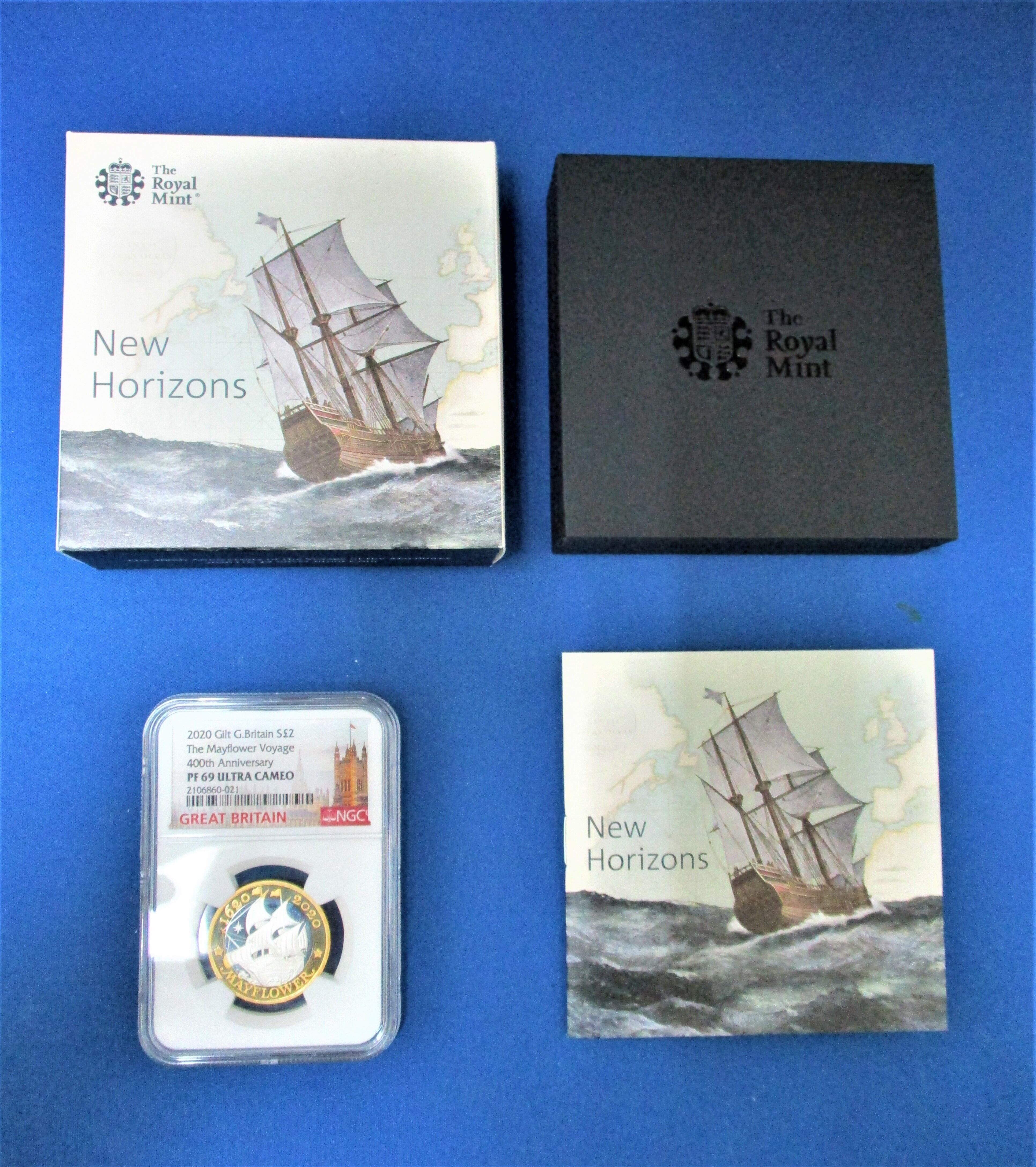 イギリス・メイフラワー号出航400周年 2ポンド銀貨/2020年/金メッキ/NGC PF69 ウルトラカメオ/オリジナルケースと仕様書付き