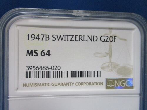 スイス 20フラン金貨☆HELVETIA(ヘルヴェティア)/1947年B/NGC MS64/鑑定済・本物保証