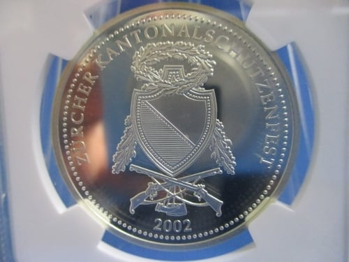 2002年にチューリッヒで射撃祭が開催された時に発行され、世界的にコレクターの多い射撃祭シリーズの中でも特に人気の高いコインです。