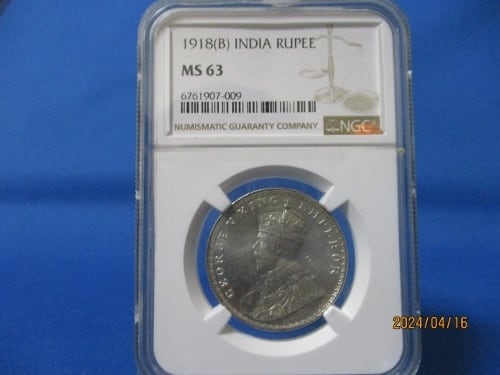 インド 1ルピー銀貨☆1918年B/未使用/ジョージ5世/NGC MS63/アンティークコイン/